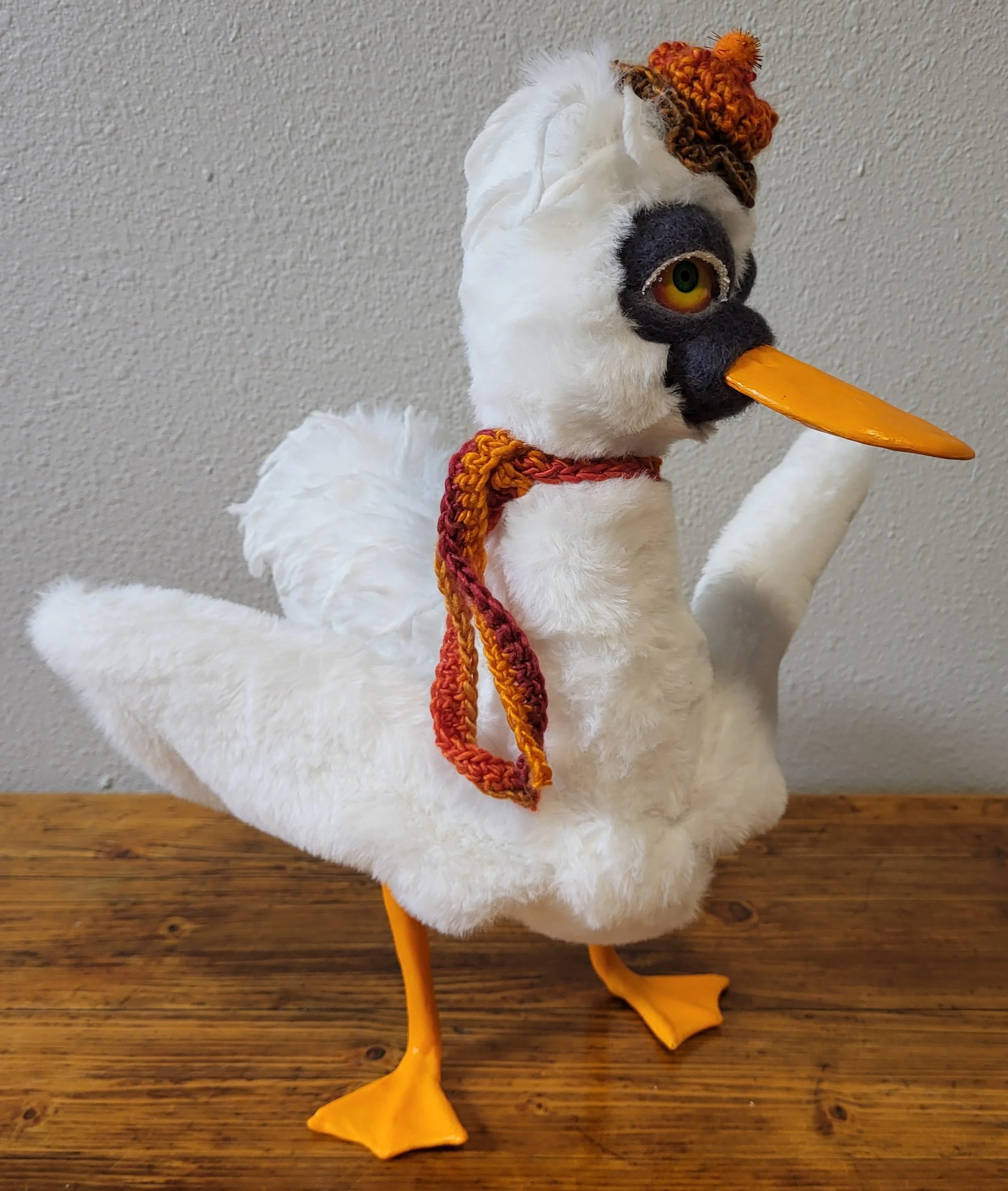 Hubert is a charming 15-inch-high duck that captures the attention of all who see him. He is lovingly crafted from soft faux fur, providing a delightful tactile experience. His wings are designed with a flexible wire, allowing them to be gently adjusted for different poses and expressions. The sculpted details of his bill and feet add a touch of realism that enhances his overall appearance. Felted eyelids and the area surrounding his bill contribute to his expressive face, giving him a unique personality. Completing his stylish look, Hubert sports a cozy hat and a vibrant scarf that are both crocheted. Moreover, his head is jointed, allowing for additional movement and positioning options, enhancing his charm even further.